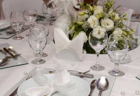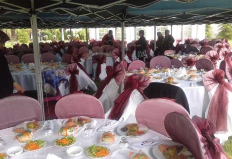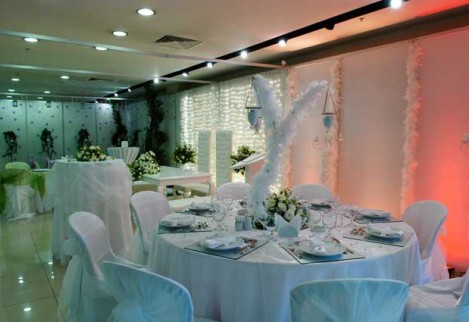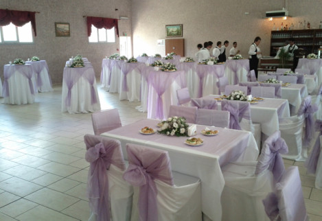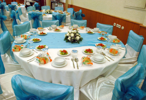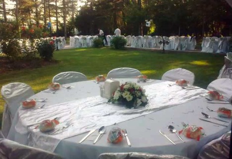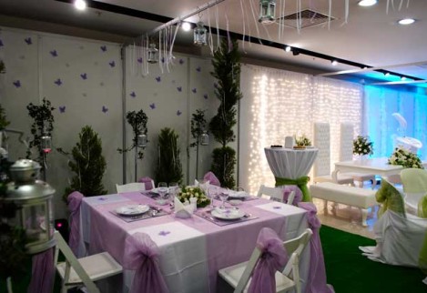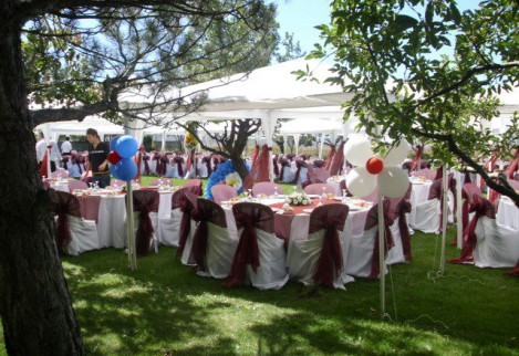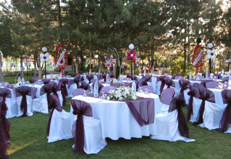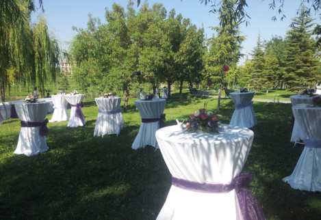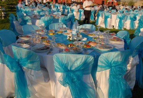 Birinci sınıf ekipmanlar, çiçekler, yüzen mumlarla bezenmiş ve şifondan organzeye davetin tarzına uygun örtülerle süslenmiş kokteyl masaları…